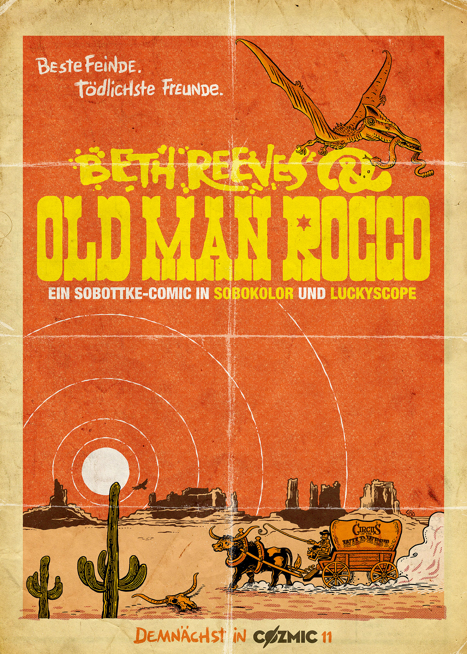 Einige von euch haben die kleine Sensation bereits auf Belas Bluesky-Account mitbekommen: Rocco kehrt zurück! Nach seinem großen Finale in unserem Bestseller DIE LEGENDE VON KRONOS ROCCO erscheint noch ein letzter Abgesang auf unseren berüchtigten Revolvermann: Die zehnseitige Geschichte BETH REEVES & OLD MAN ROCCO, wie immer geschrieben und gezeichnet von Bela Sobottke, wird demnächst in Ausgabe 11 der Anthologiereihe COZMIC bei den Kollegen von Kult Comics veröffentlicht. COZMIC 11 erscheint voraussichtlich im Mai und das beste daran: Wir werden den Band auch an unserem Stand beim diesjährigen Comic-Salon Erlangen anbieten, wo Bela euch das gute Stück gerne signieren wird. Mehr dazu demnächst!